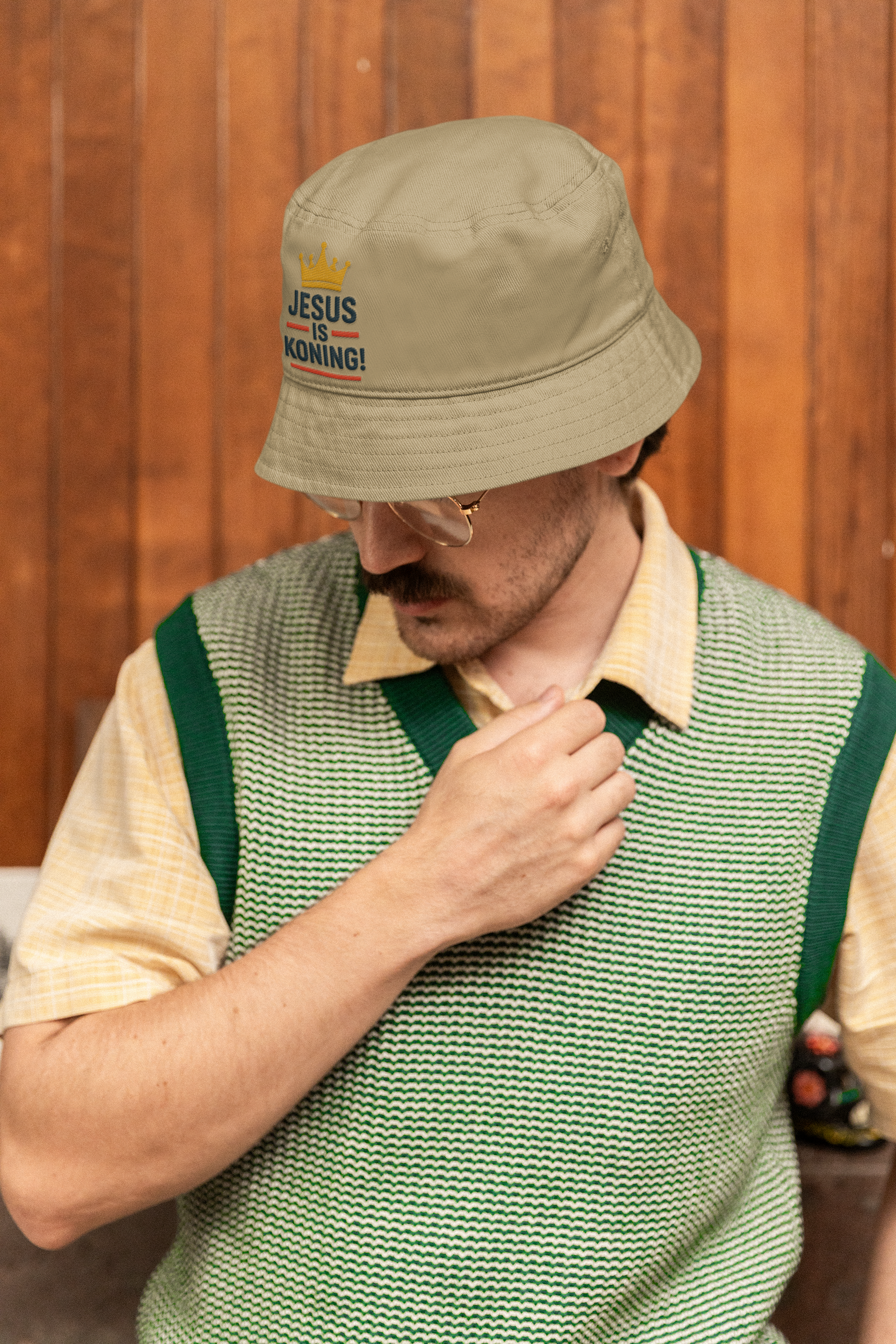 Declare your faith with quiet boldness and timeless style. This stone/khaki bucket hat features the powerful Afrikaans message “Jesus is Koning” (Jesus is King) paired with a golden crown—symbolizing the eternal reign of Christ.